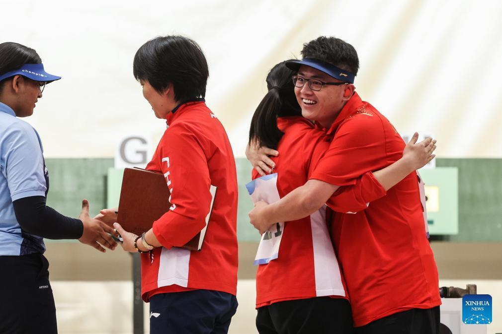 Zhang Bowen (1.v.r.) und Jiang Ranxin (2.v.r.) aus China feiern nach dem Goldmedaillenmatch im 10m-Luftpistolenschießen mit der gemischten Mannschaft. (Xinhua/Shan Yuqi)