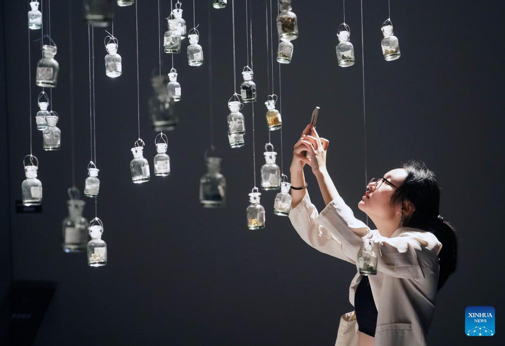 Eine Besucherin macht am 2. Oktober 2023 Fotos in einer Wissenschafts- und Kunstausstellung im Beijing Times Art Museum. (Xinhua/Ren Chao)