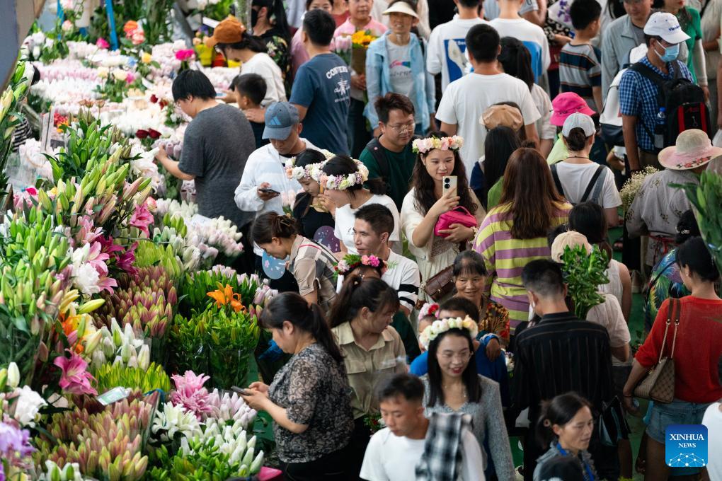 Viele Menschen wählen während der Ferien zum Mondfest und Nationalfeiertag in der südwestchinesischen Stadt Kunming Blumen im Dounan-Blumenmarkt aus. Dieser Blumenmarkt ist der größte Markt für frische Schnittblumen in ganz Asien. (Foto vom 5. Oktober 2023, Xinhua/Chen Xinbo)