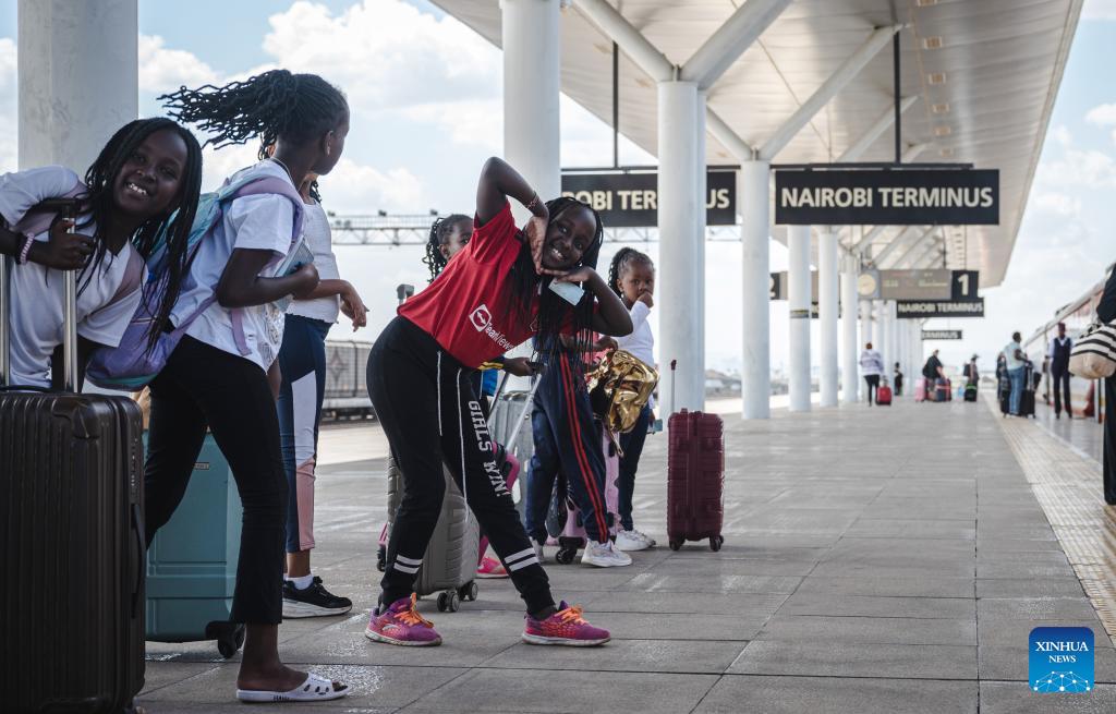 Kinder warten am 6. Oktober 2023 am Bahnhof Nairobi der Mombasa-Nairobi-Eisenbahn in Kenia auf das Einsteigen in einen Zug. (Xinhua/Wang Guansen)