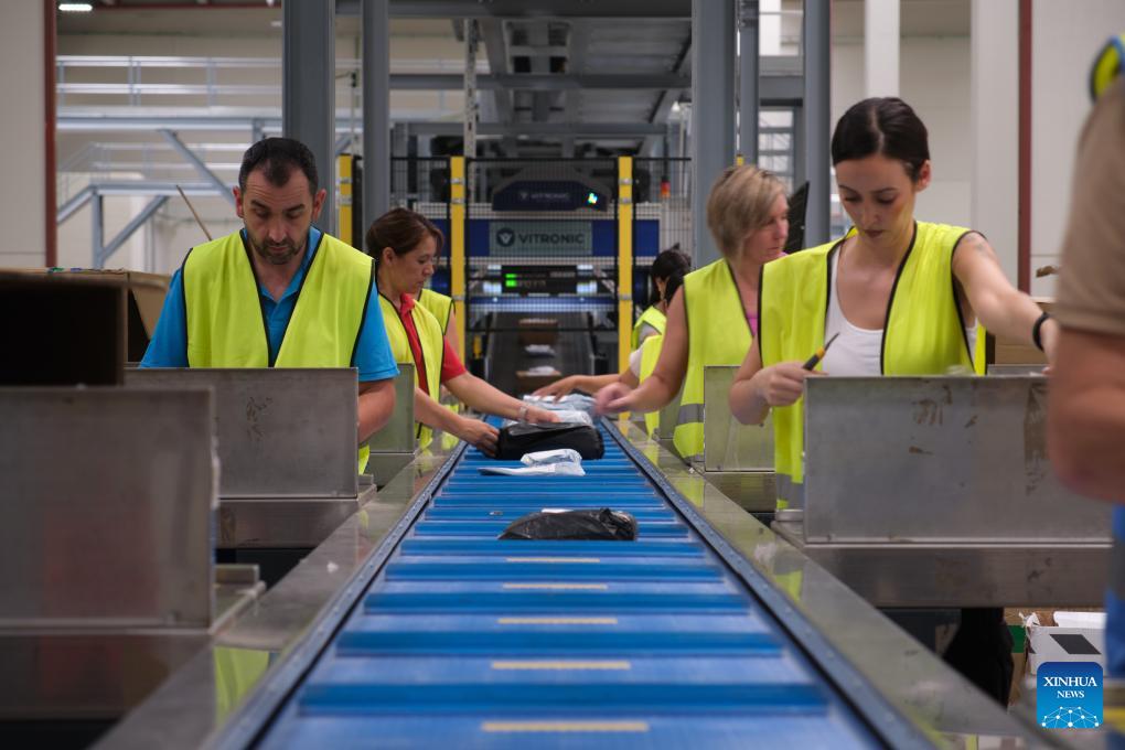 Mitarbeiter sind am 31. Juli 2023 in einem Cainiao-Logistikzentrum in Madrid, Spanien, beschäftigt. (Xinhua/Meng Dingbo)