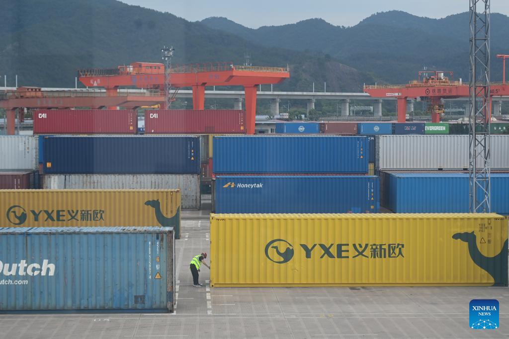 Ein Mitarbeiter inspiziert am 18. Juli 2023 einen Container auf einem Bahnhof in Yiwu in der ostchinesischen Provinz Zhejiang. (Xinhua/Huang Zongzhi)