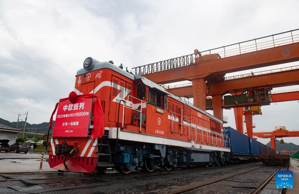 Ein China-Europa-Güterzug fährt am 29. Juli 2023 von einem Bahnhof in Yiwu in der ostchinesischen Provinz Zhejiang ab. (Xinhua/Shi Kuanbing)