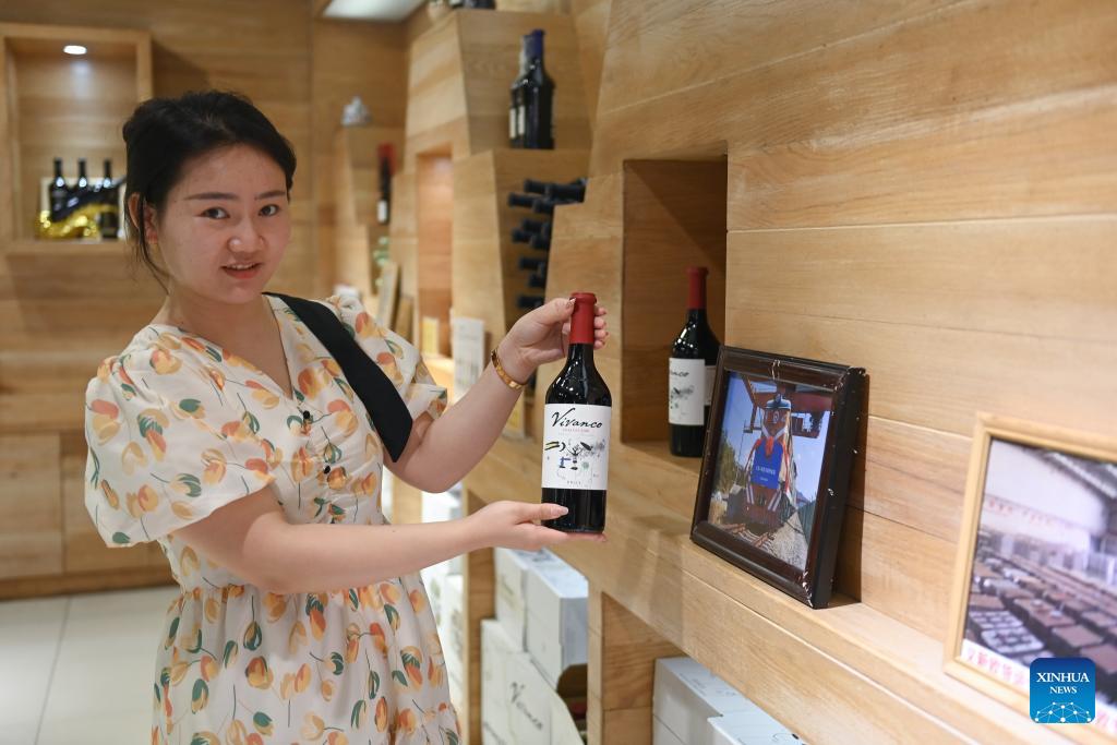 Eine Angestellte des Yiwu International Trade Market in der ostchinesischen Provinz Zhejiangzeigt am 18. Juli 2023 eine aus Spanien importierte Weinflasche. (Xinhua/Huang Zongzhi)
