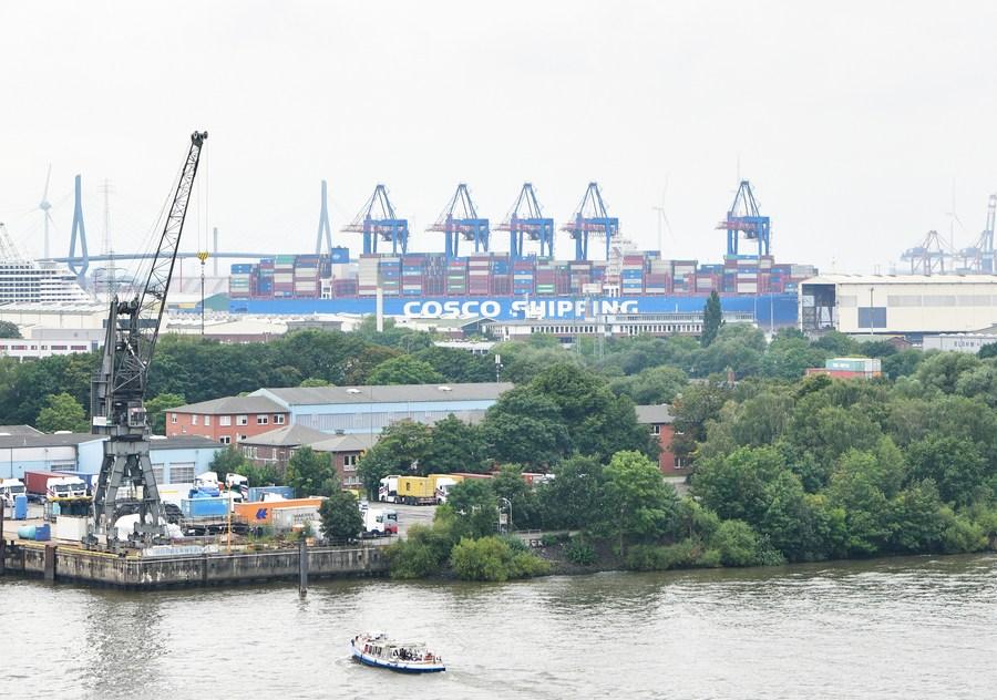 Ein Containerschiff von Cosco Shipping Virgo am Hamburger Hafen. (Foto vom 12. August, Ren Pengfei/Xinhua)