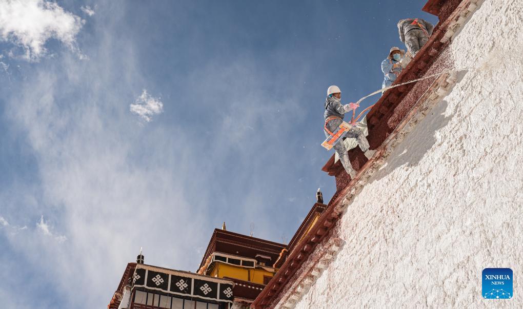 Arbeiter streichen am 18. Oktober 2023 die Wand des Potala-Palastes während der jährlichen Renovierungsarbeiten des alten architektonischen Komplexes in Lhasa in der südwestchinesischen Autonomen Region Tibet. (Foto von Tenzin Nyida/Xinhua)