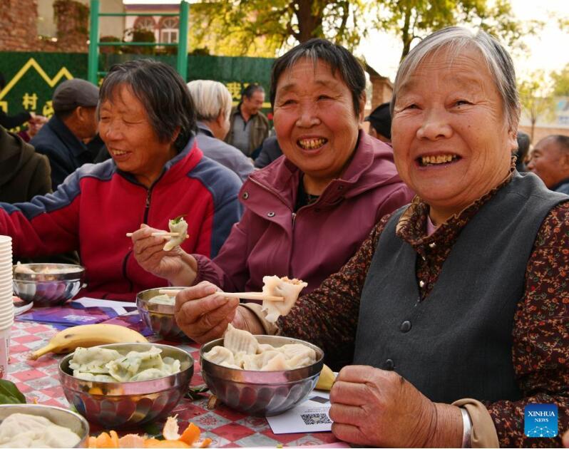 Senioren essen gemeinsam Jiaozi auf einem Platz eines Dorfes in der Stadt Shijiazhuang in der nordchinesischen Provinz Hebei. (Foto vom 22. Oktober, Li Mingfa/Xinhua)
