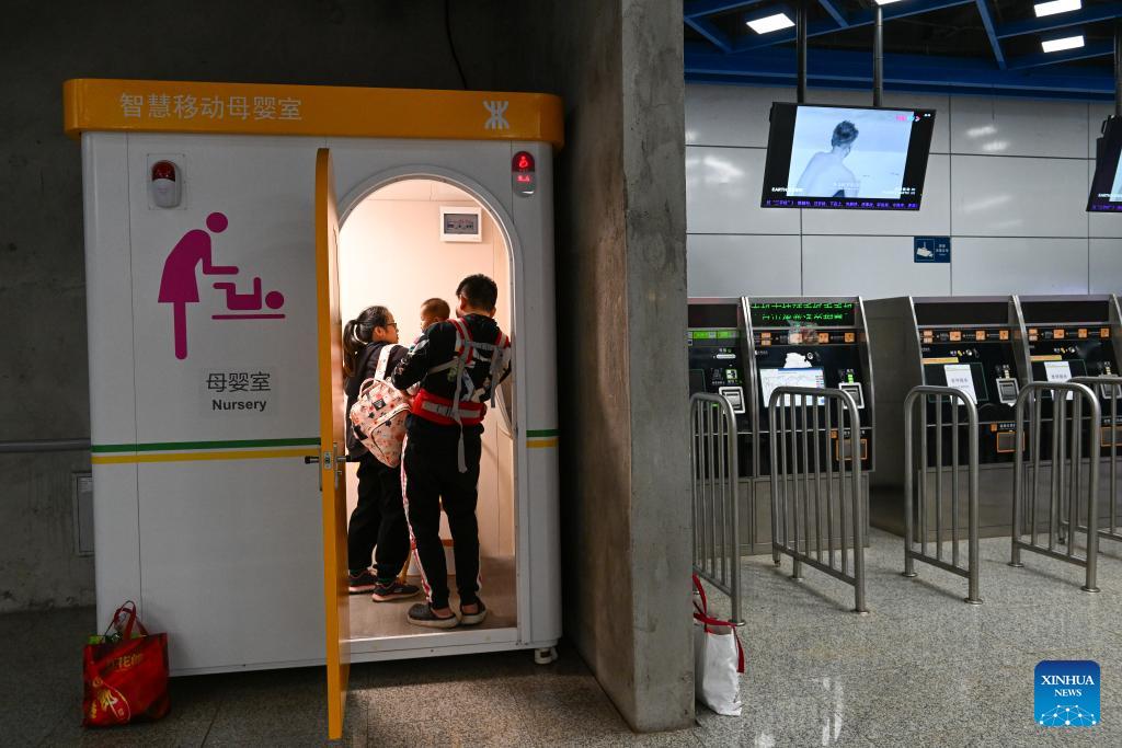 Ein Paar wickelt sein Baby in einem mobilen Wickelraum in einer U-Bahn-Haltstelle. (Foto vom 17. November 2023, Xinhua/Mao Siqian)