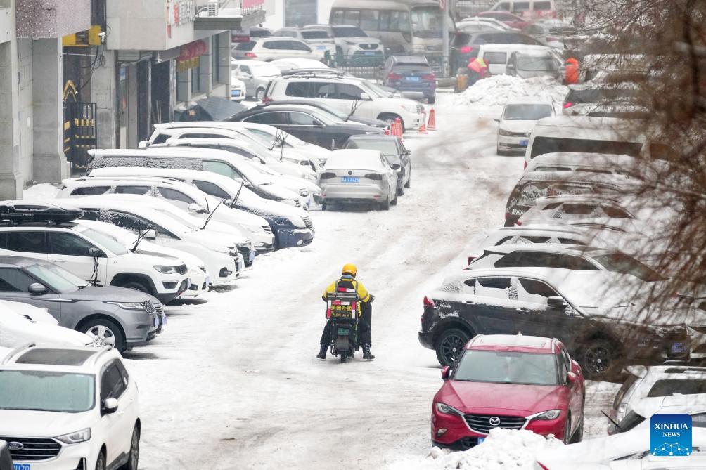 Ein Zusteller fährt am 16. November2023 in Harbin durch den Schnee. (Xinhua/Wang Jianwei)
