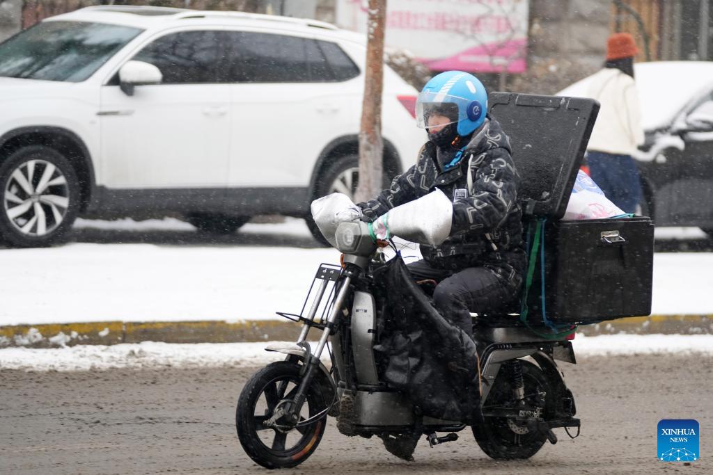 Ein Lieferwagenfahrer fährt am 16. November 2023in Harbin im Schnee. (Xinhua/Wang Jianwei)