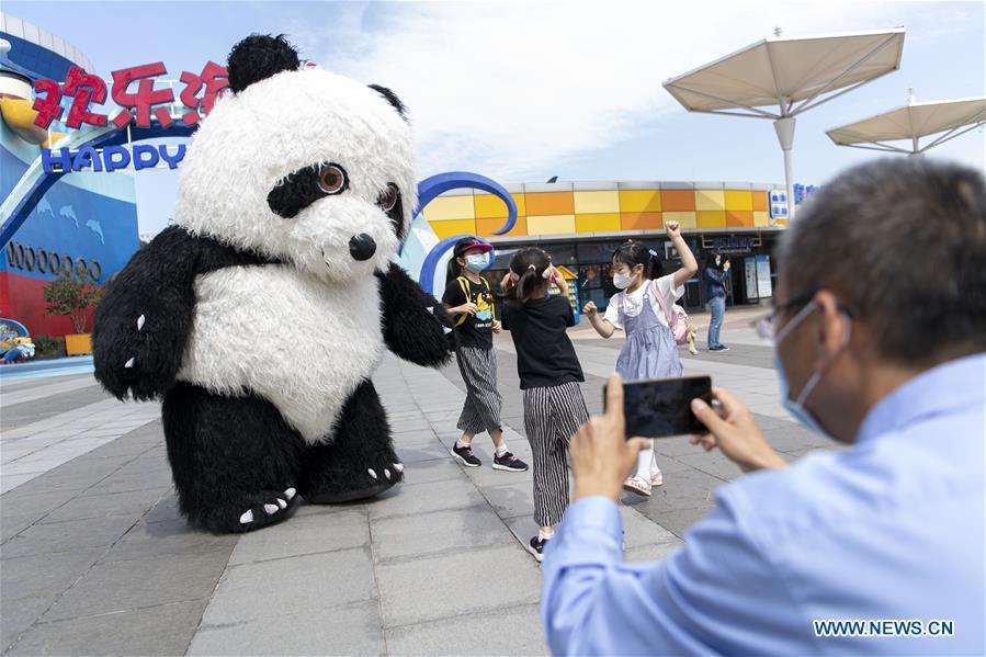 Touristen sind im Happy Valley Wuhan von einem Mitarbeiter im Panda-Kostüm begeistert. (Foto: Xinhua, 19. Mai 2020)