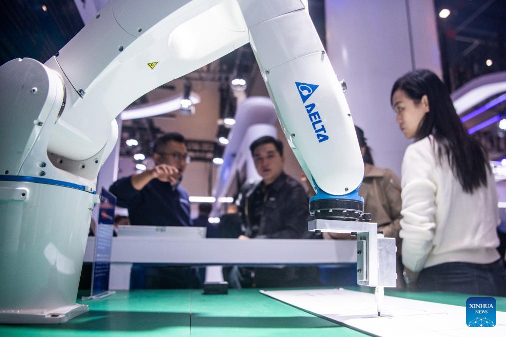 Ein Aussteller stellt einem Besucher die Exponate vor. (Foto vom 20. November 2023, Xinhua/Wu Zhizun)