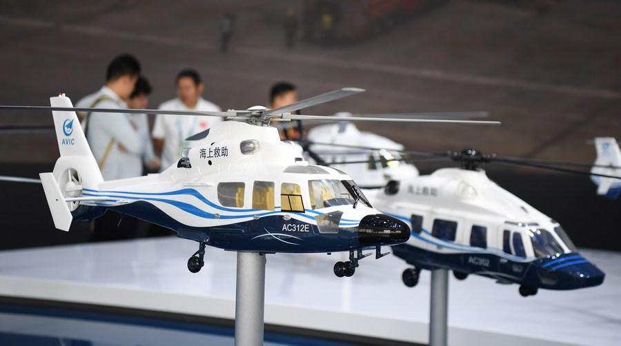 Dieses Foto zeigt Modelle von Seenotrettungshubschraubern, die während der „Aero Asia 2023“ in Zhuhai ausgestellt werden. (Foto vom 23. November 2023, Denghua/Xinhua)