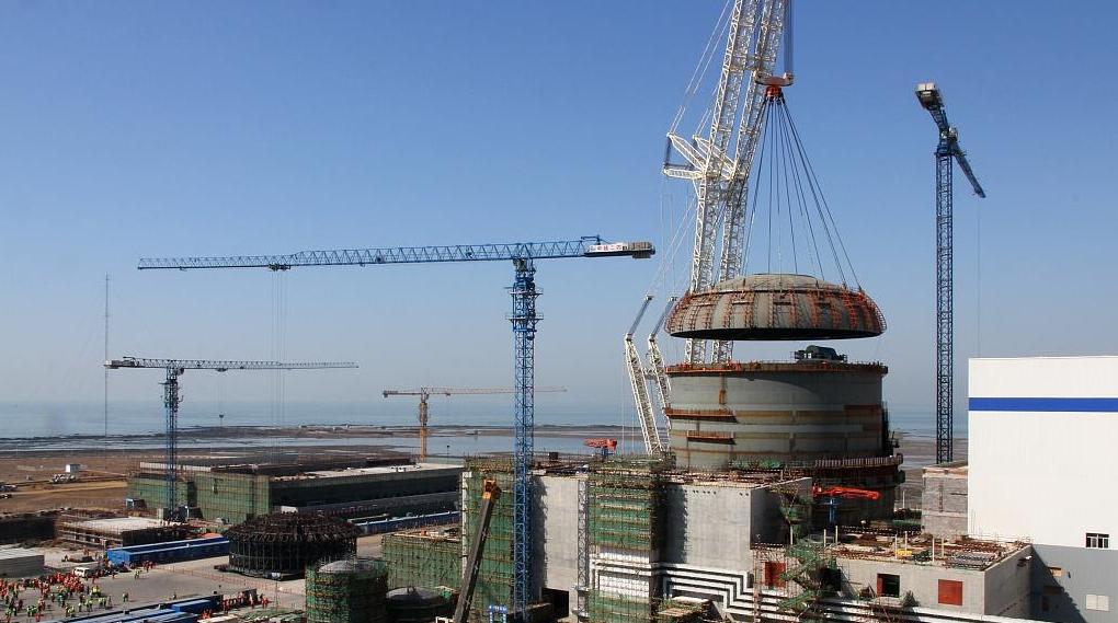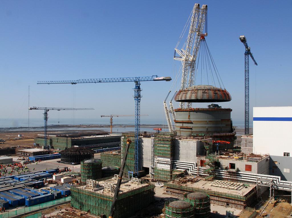 Die Kuppel für den Sicherheitsbehälter der Reaktorinsel Nr. 1 im Kernkraftwerk der Stadt Haiyang wird angehoben und installiert. (29. März 2013)
