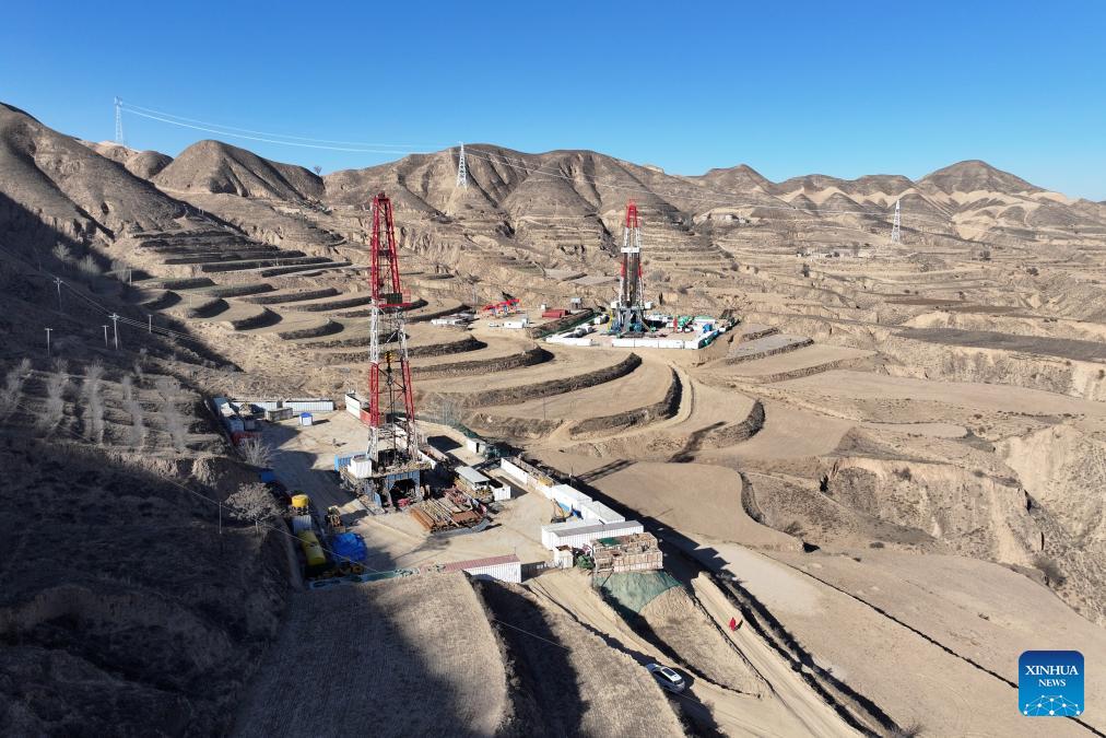 Diese Luftaufnahme zeigt eine Bohrstelle auf dem Hongde-Ölfeld in der nordwestchinesischen Provinz Gansu. (Foto vom 30. November 2023, Changqing Oilfield/Xinhua)