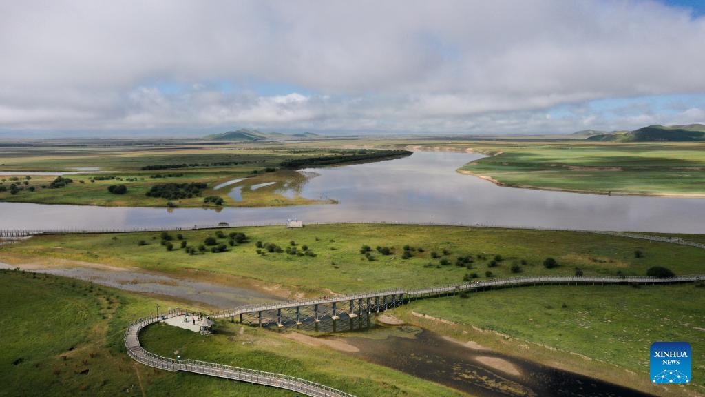 Diese Luftaufnahme vom 22. August 2023 zeigt den Zickzack-Wasserlauf des Gelben Flusses im Kreis Ruoergai im Autonomen Bezirk Aba der Tibetisch-Qiang in der südwestchinesischen Provinz Sichuan. (Xinhua/Wang Yijie)