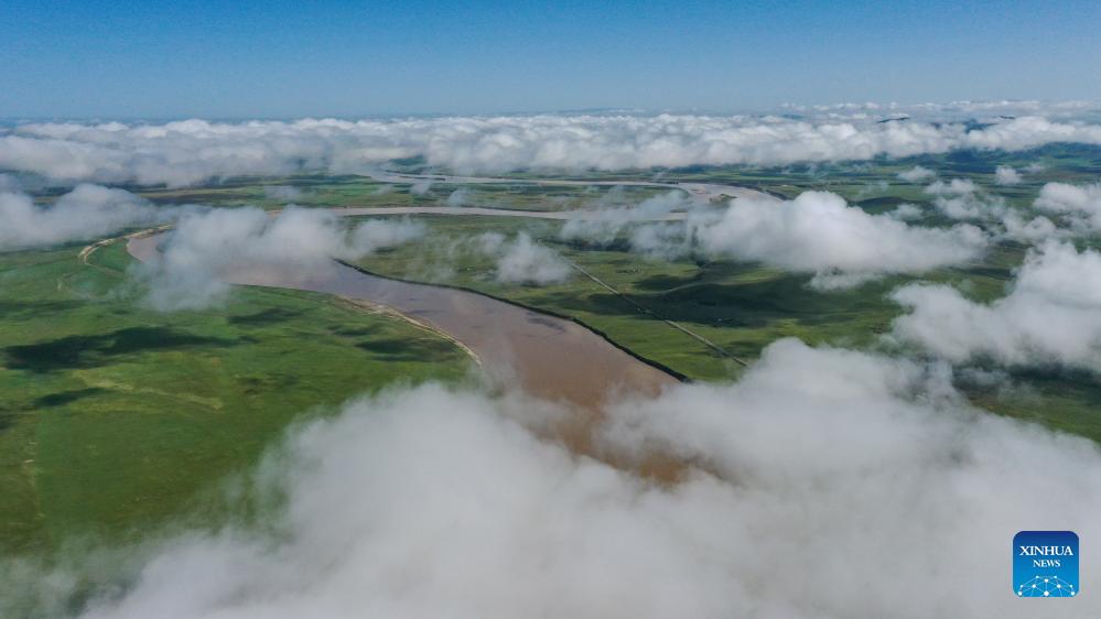 Diese Luftaufnahme vom 22. August 2023 zeigt den Zickzack-Wasserlauf des Gelben Flusses im Kreis Ruoergai im Autonomen Bezirk Aba der Tibetisch-Qiang in der südwestchinesischen Provinz Sichuan. (Xinhua/Wang Xi)