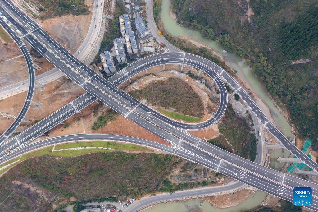 Das Luftbild zeigt ein Autobahnkreuz der Wuxi-Zhenping Autobahn. (Foto vom 4. Dezember 2023, Xinhua/Huang Wei)