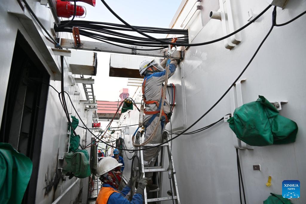 Arbeiter verlegen Drähte auf „HaiyangShiyou 122“. (Foto vom 4. Dezember 2023, Li Ziheng/Xinhua)