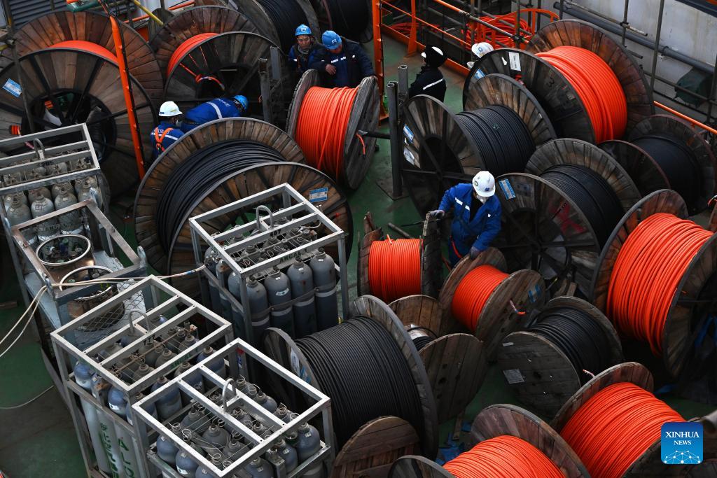 Arbeiter wickelnDrähte auf „HaiyangShiyou 122“ auf. (Foto vom 4. Dezember 2023, Li Ziheng/Xinhua)