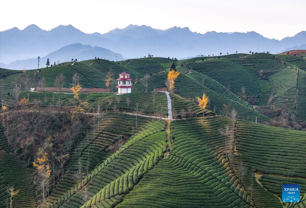 Die Luftaufnahme zeigt den grünen Teegarten in Hefeng. (Foto vom 6. Dezember 2023, Xinhua/ Yang Wenbin)
