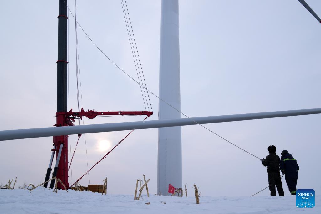 Mitarbeiter arbeiten auf der Baustelle eines Windparks im Kreis Yilan in der nordostchinesischen Provinz Heilongjiang. Heilongjiang ist jetzt größtenteils mit Eis und Schnee bedeckt, aber die Bauarbeiten und der Betrieb eines 200-Megawatt-Windparks in Yilan sind deswegen keineswegs „eingefroren“.