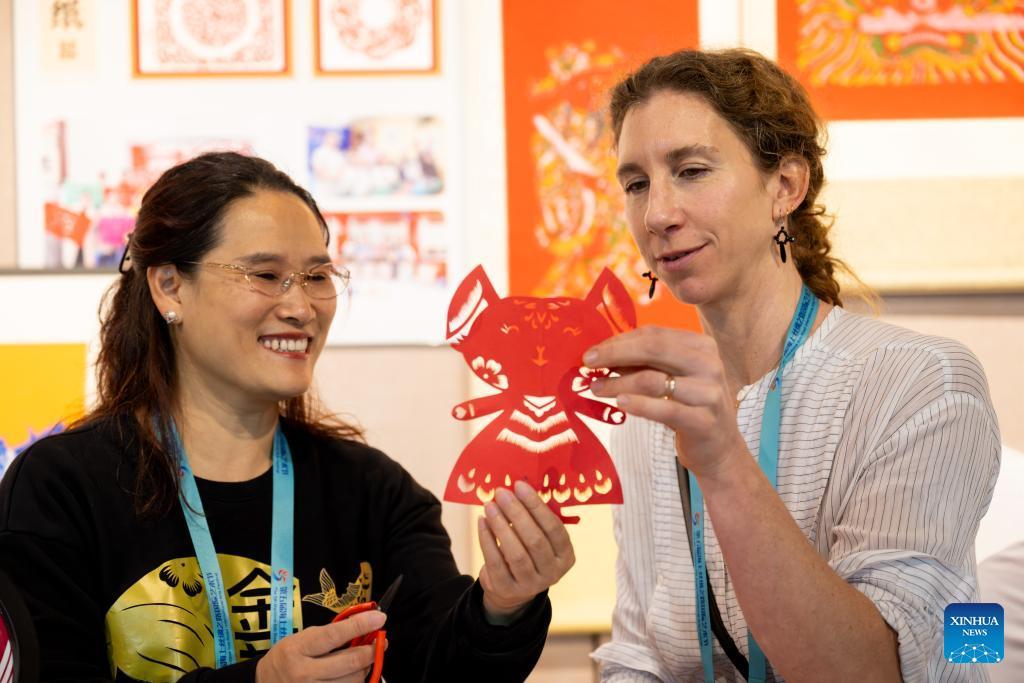 Eine italienische Künstlerin (r.) lernt von You Jinmei, der sich für die Weitergabe des immateriellen Kulturerbes engagiert, die Technik des Papierschneidens kennen. (Foto vom 9. Dezember, Xinhua/Wei Peiquan)