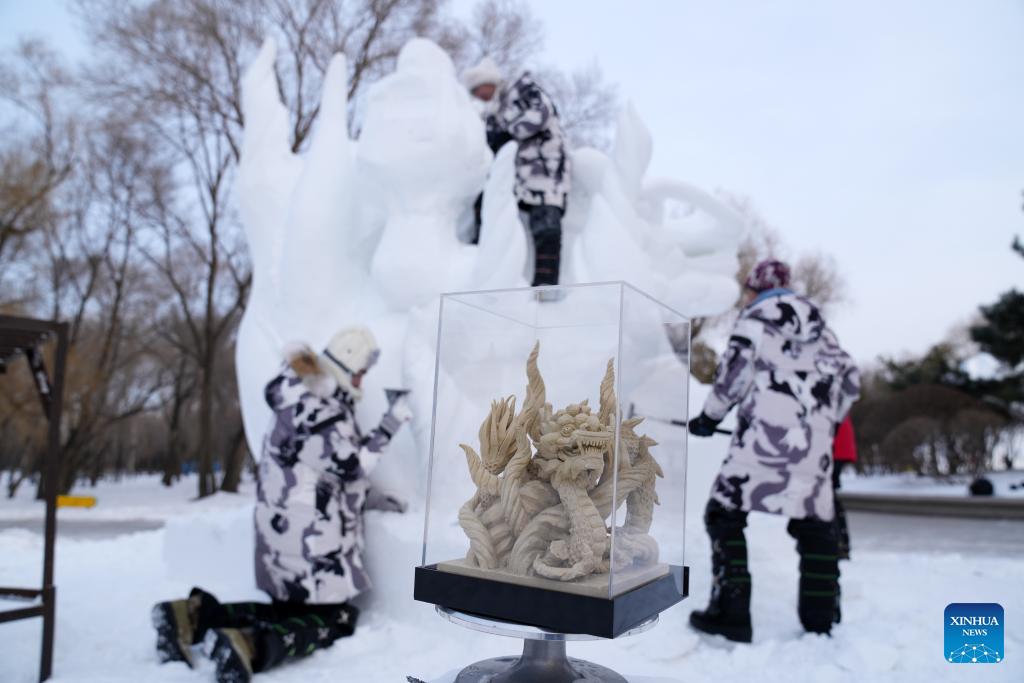 Bildhauer arbeiten an einer Schneeskulptur während eines Schneewettbewerbs in Harbin. (Foto vom 12. Dezember 2023, Xinhua/Wang Jianwei)