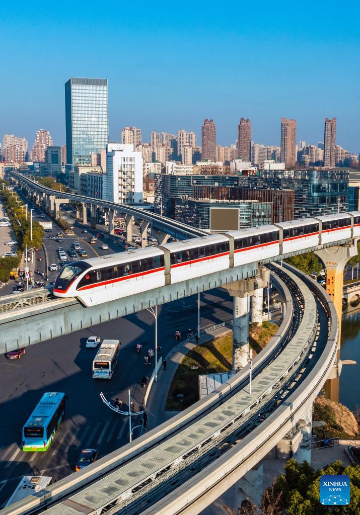 Diese Luftaufnahme vom 11. Januar 2023 zeigt einen Einschienenbahnzug, der über den Jinghu-See in der ostchinesischen Provinz Anhui fährt. (Xiao Benxiang/Xinhua)
