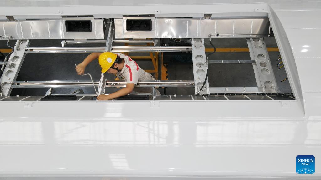 Diese Luftaufnahme vom 13. September 2023 zeigt einen chinesischen Mitarbeiter bei der Installation der Ausrüstung eines Einschienenbahnwagens in der ostchinesischen Provinz Anhui. (Xinhua/Zhang Duan)