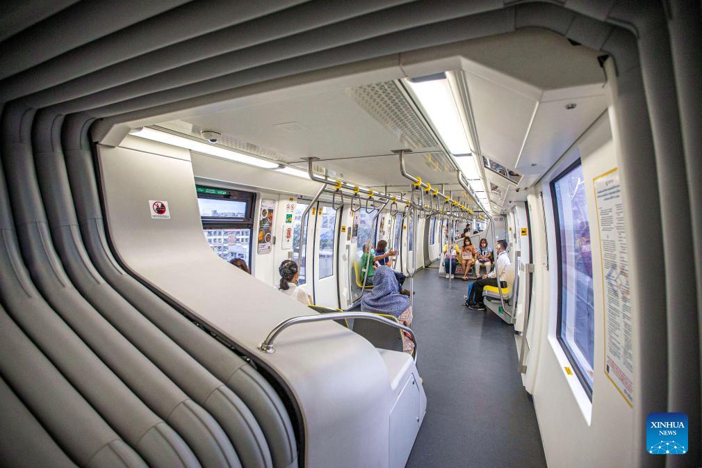 Fahrgäste nehmen am 14. September 2023 die Einschienenbahn der „Gelben Linie“ in Bangkok. (Xinhua/Wang Teng)