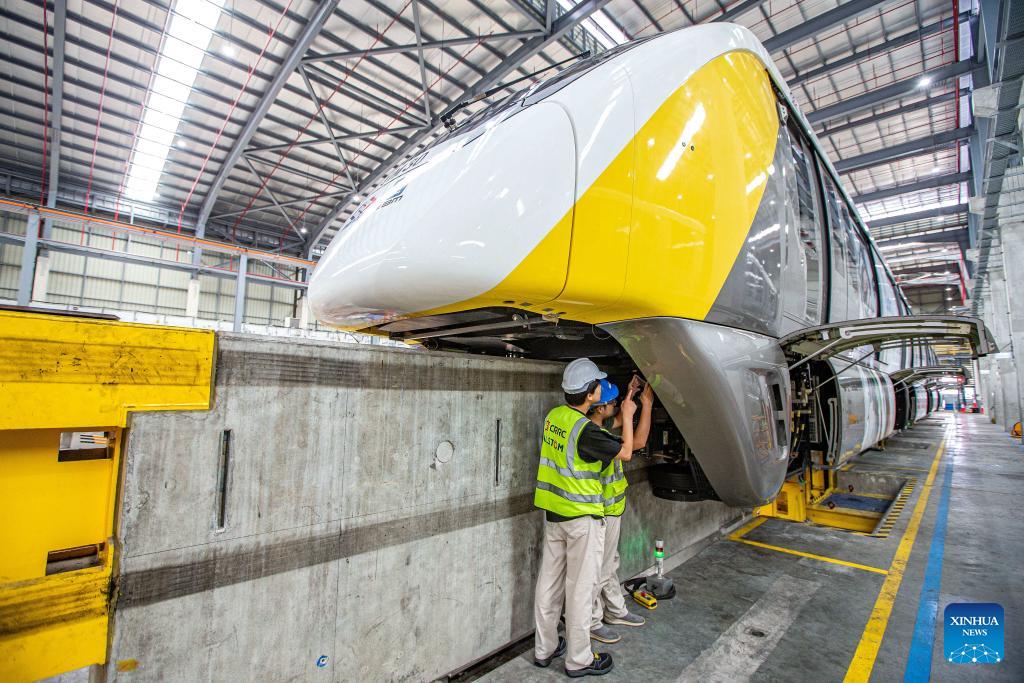 Chinesische Mitarbeiter inspizieren am 22. September 2023 Züge der „Gelben Linie“ in Bangkok. (Xinhua/Wang Teng)