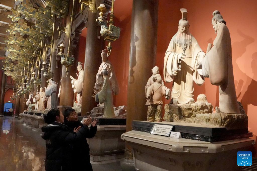 Menschen betrachten Skulpturen in der Tourismusattraktion „Nishan Sacredland“. (Foto vom 13. Dezember 2023, Xinhua/ Wang Yuguo)