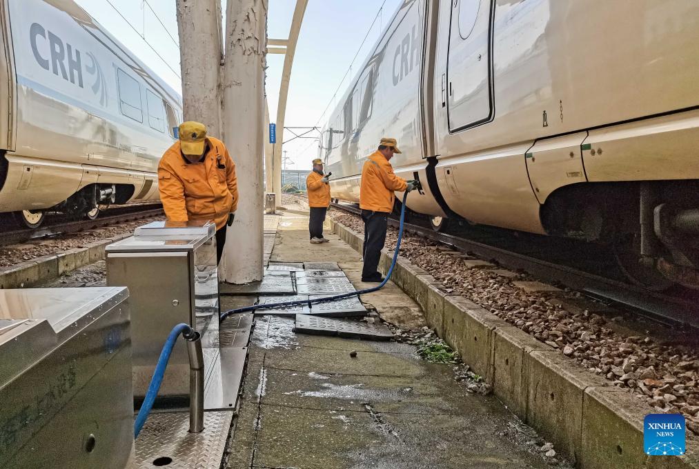 Mitarbeiter pumpen Wasser in einen Zug am Bahnhof Hongqiao in Shanghai. (Foto vom 17. Dezember 2023, Xinhua)