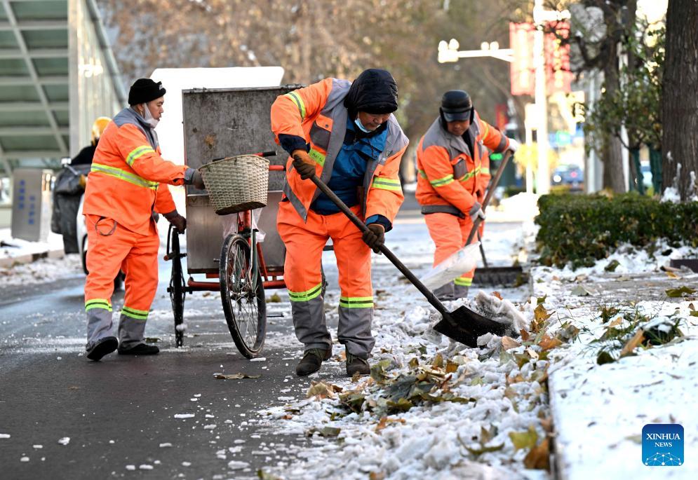 Arbeiter der Stadtreinigung räumen auf der Straße in der nordchinesischen Provinz Hebei Schnee. (Foto vom 17. Dezember 2023, Chen Qibao/Xinhua)