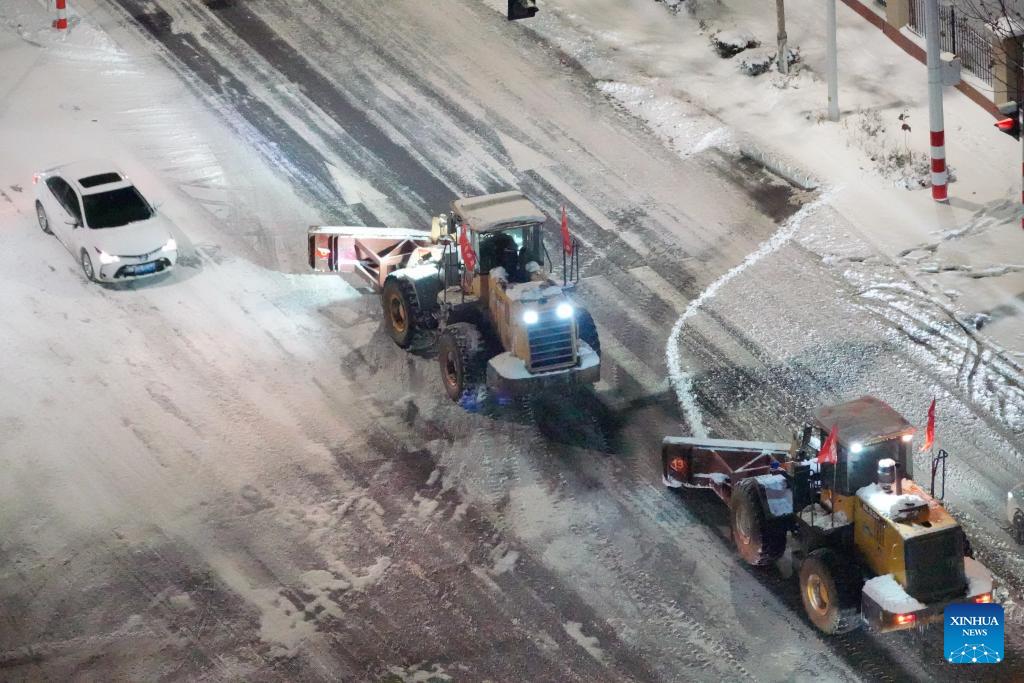Schneepflüge räumen Schnee von einer Straße in der Provinz Shandong, 16. Dezember 2023. (Tang Ke/Xinhua)