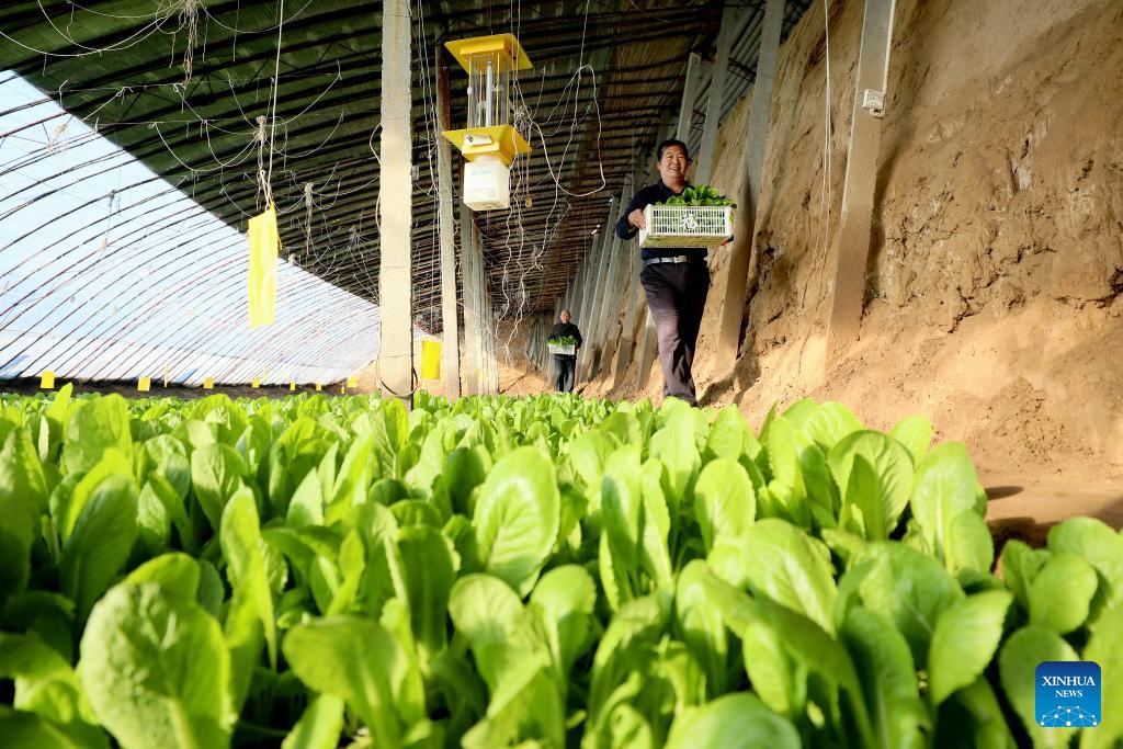 Landwirte tragen in einem Gewächshaus in der nordchinesischen Provinz Hebei Gemüse. (Foto vom 17. Dezember 2023, Mu Yu/Xinhua)