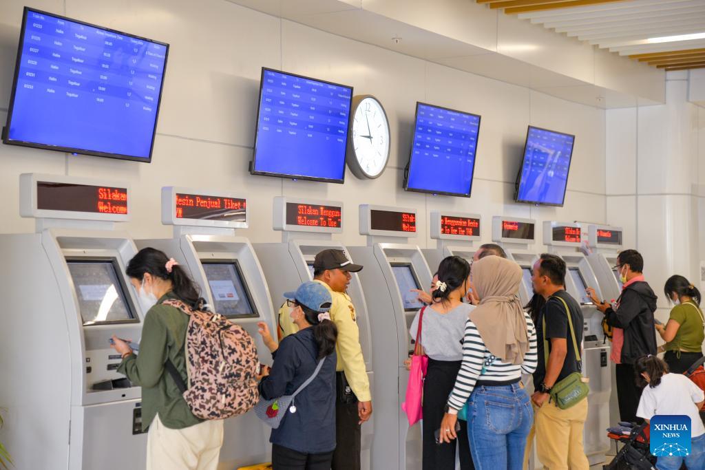 Fahrgäste erhalten an Fahrkartenautomaten im Bahnhof Halim in Jakarta Fahrkarten. (Foto vom 17. Dezember 2023, Xu Qin/Xinhua)