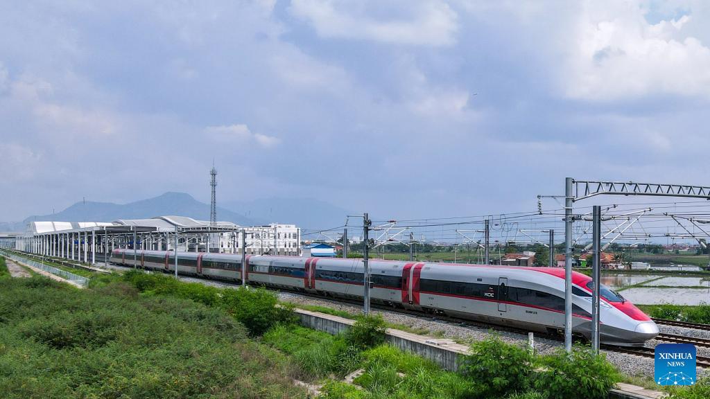 Diese Luftaufnahme vom 6. Dezember 2023 zeigt einen elektrischen Hochgeschwindigkeits-Triebzug bei der Abfahrt vom Bahnhof Tegalluar in Bandung in Indonesien. (Foto vom 17. Dezember 2023, Xu Qin/Xinhua)