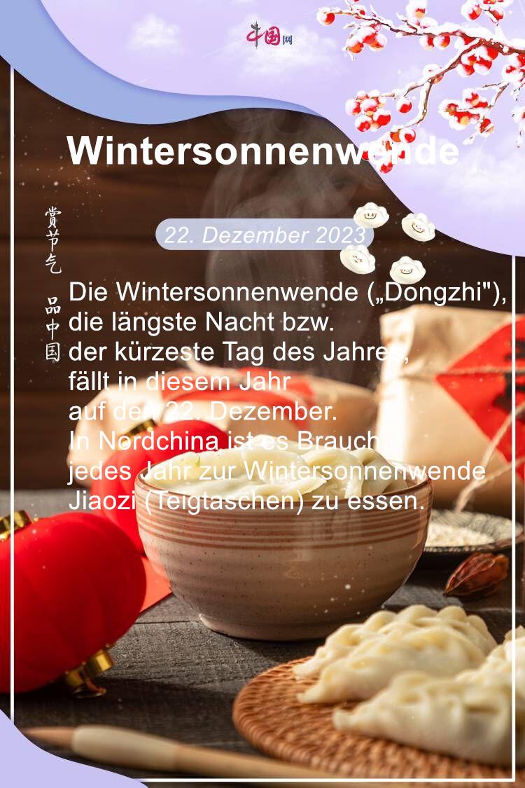 Die Wintersonnenwende („Dongzhi"), die längste Nacht bzw. der kürzeste Tag des Jahres, fällt in diesem Jahr auf den 22. Dezember. In Nordchina ist es Brauch, jedes Jahr zur Wintersonnenwende Jiaozi (Teigtaschen) zu essen.