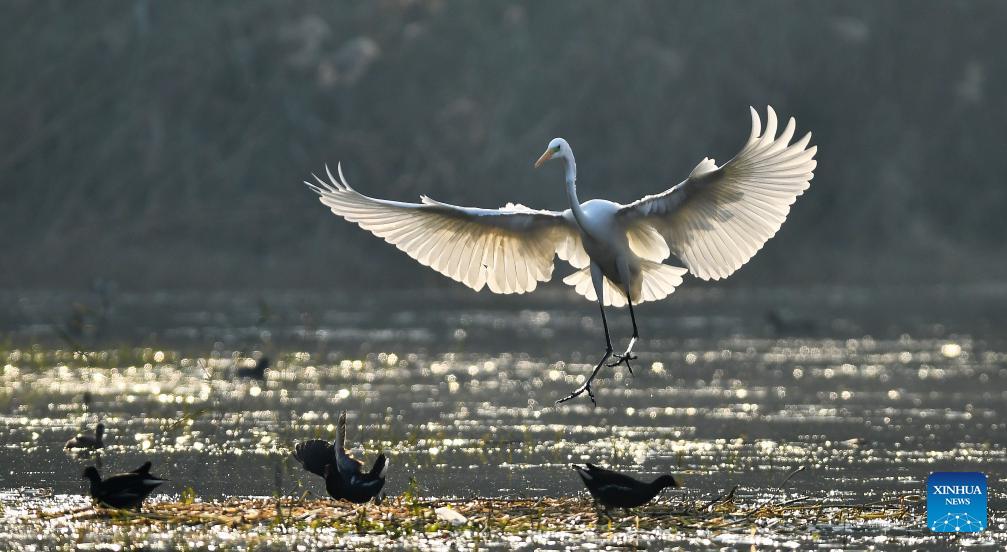 Ein Reiher fliegt am 5. Dezember 2023 über einen Fluss in der Stadt Tengzhou in der ostchinesischen Provinz Shandong. (Foto von Li Zhijun/Xinhua)