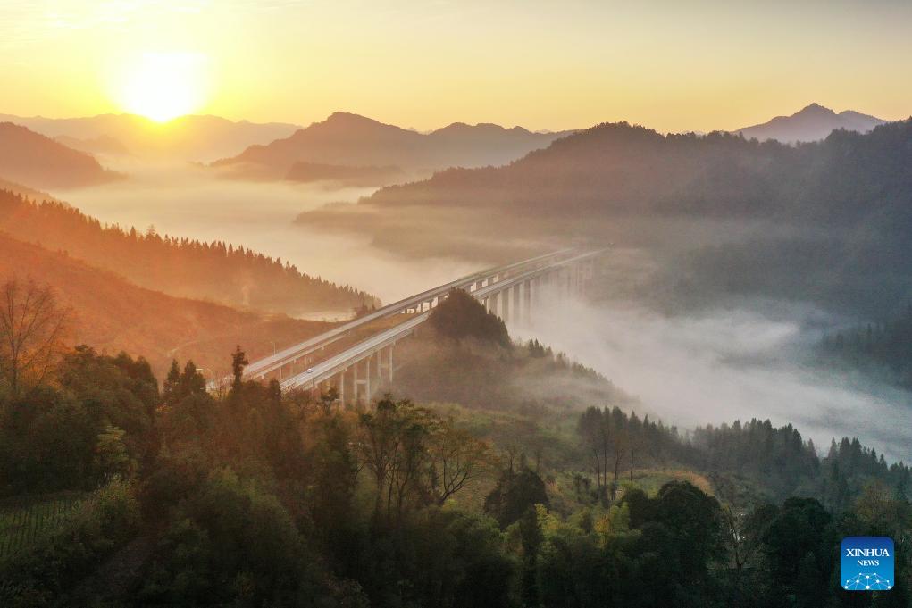 Diese Luftaufnahme vom 5. Dezember 2023 zeigt die Landschaft im Dorf Bunadong in der zentralchinesischen Provinz Hunan. (Foto von Zeng Xianghui/Xinhua)