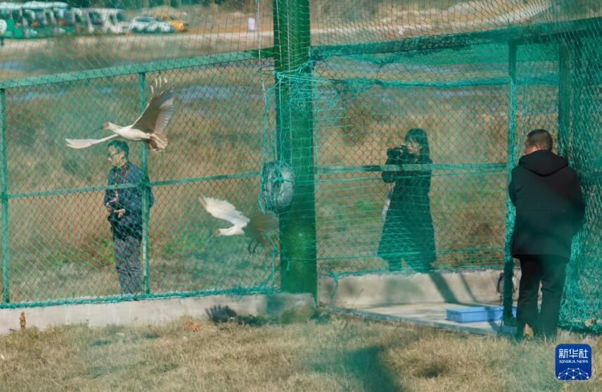 Nipponibis werden in einenriesigen Trainingsnetzkäfig ausgesetzt, von wo aus sie nach einem Renaurasierungstraining wieder in die Wildnis fliegen werden. (Foto vom 27. Dezember, Zhou Mi/Xinhua)