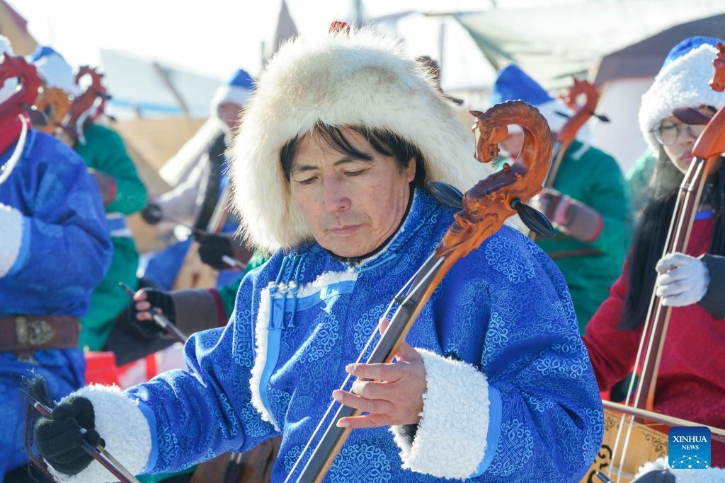 Menschen bei einer Winterfischereiveranstaltung auf dem zugefrorenen Lianhuan-See in der nordostchinesischen Provinz Heilongjiang. (Foto vom 27. Dezember 2023, Wang Song/Xinhua)