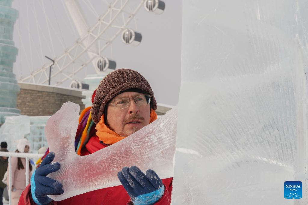 Ein Teilnehmer arbeitet an einer Eisskulptur während des Eisskulpturenwettbewerbs. (Foto vom 3. Januar 2024, Xinhua/Wang Song)