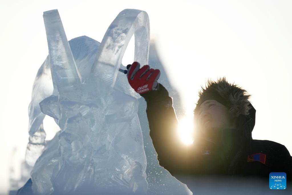 Ein Teilnehmer arbeitet an einer Eisskulptur während des Eisskulpturenwettbewerbs. (Foto vom 3. Januar 2024, Xinhua/Wang Song)