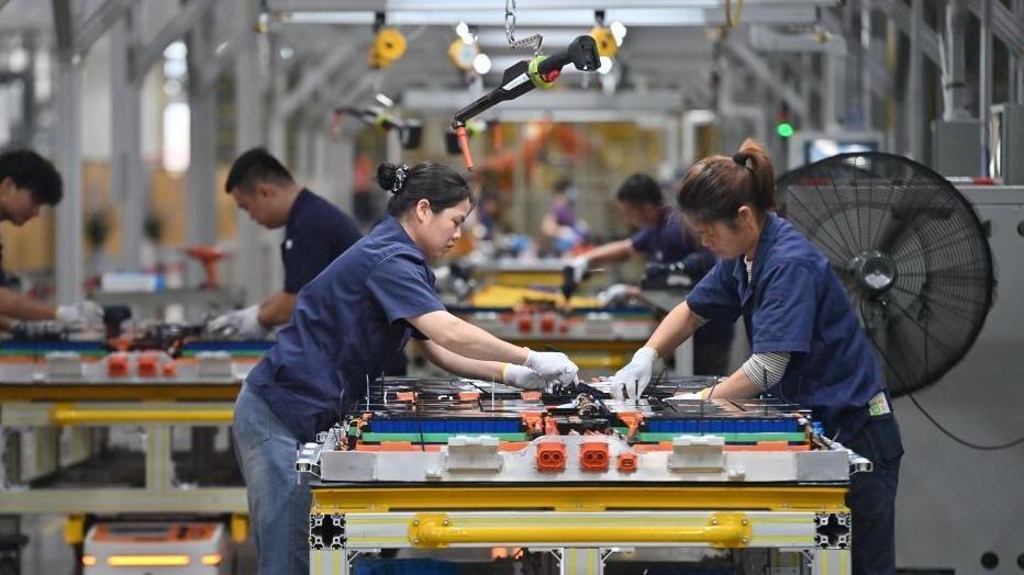 Techniker arbeiten an einer Produktionslinie eines Herstellers von Batterien für NEV in Liuzhou. (Foto vom Mai. 10, 2023, Huang Xiaobang/Xinhua)