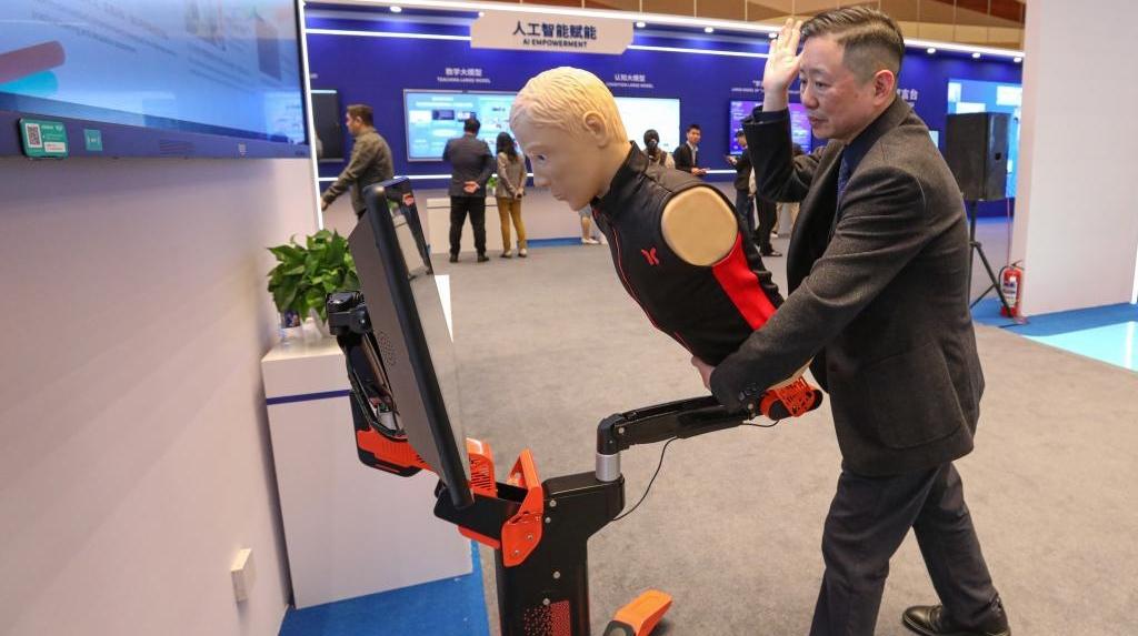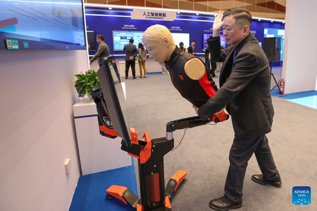 Ein Mitarbeiter demonstriert während der Weltkonferenz für digitale Bildung 2024 in Shanghai ein digitales Erste-Hilfe-Lerngerät für den Campus. (Foto vom 30. Januar 2024, Xin Mengchen/Xinhua)