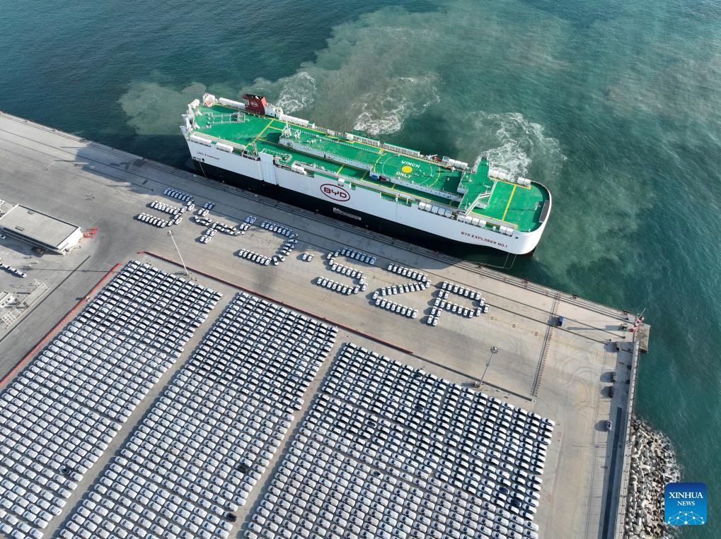 Das Fahrzeugtransportschiff „BYD EXPLORER NO.1“ trifft am 14. Januar 2024 im Xiaomo International Logistics Port in der südchinesischen Provinz Guangdong ein. (Foto von Xinhua)
