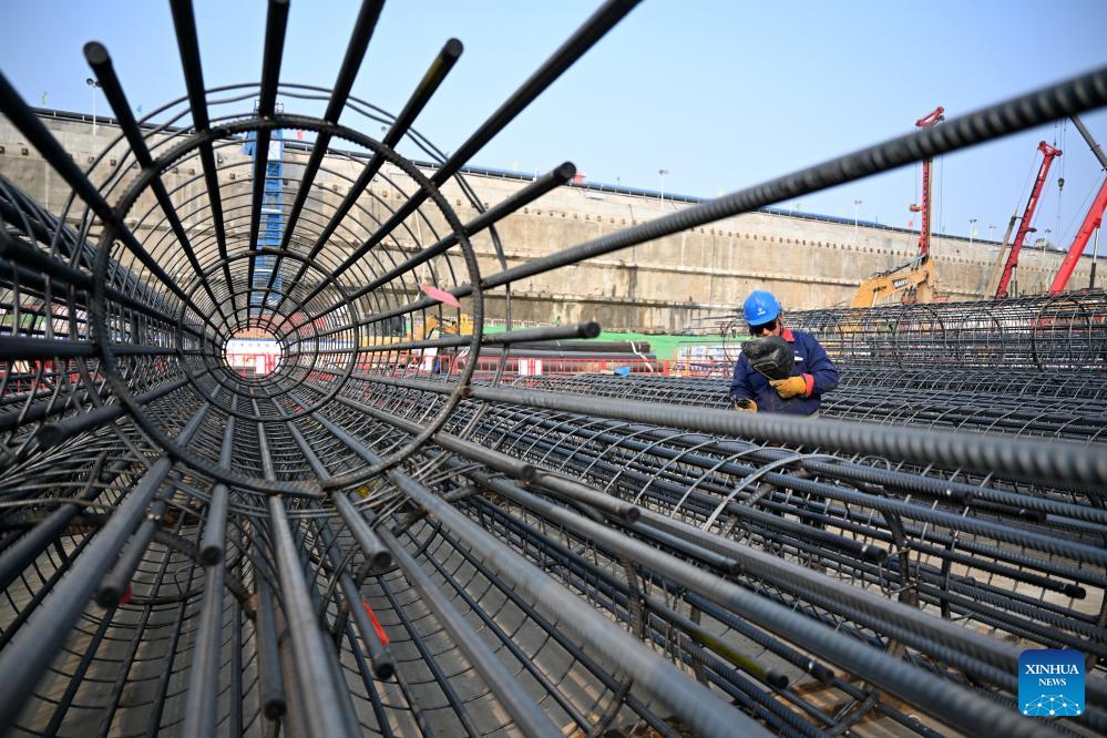 Ein Arbeiter schweißt Stahl auf der Baustelle eines Fernbahnhofs und eines internationalen Handelszentrums in der Xiong'an New Area. (Foto vom 6. Februar 2024, Xinhua/Mu Yu)